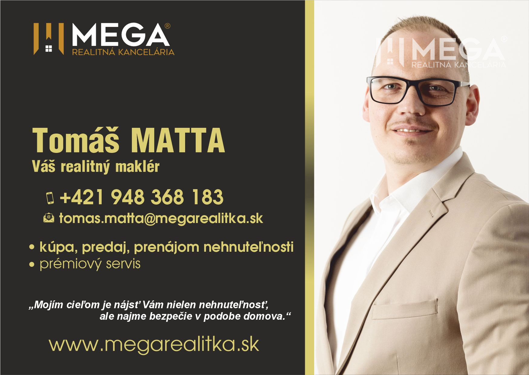 Je pre mňa prvoradým záväzkom poskytnúť Vám špičkový servis, bez zaváhania a budem Vás sprevádzať celou realitnou transakciou s pridanou hodnotou v podobe ľudskosti a dobrého pocitu zo správneho rozhodnutia, ktorý pretrvá roky.