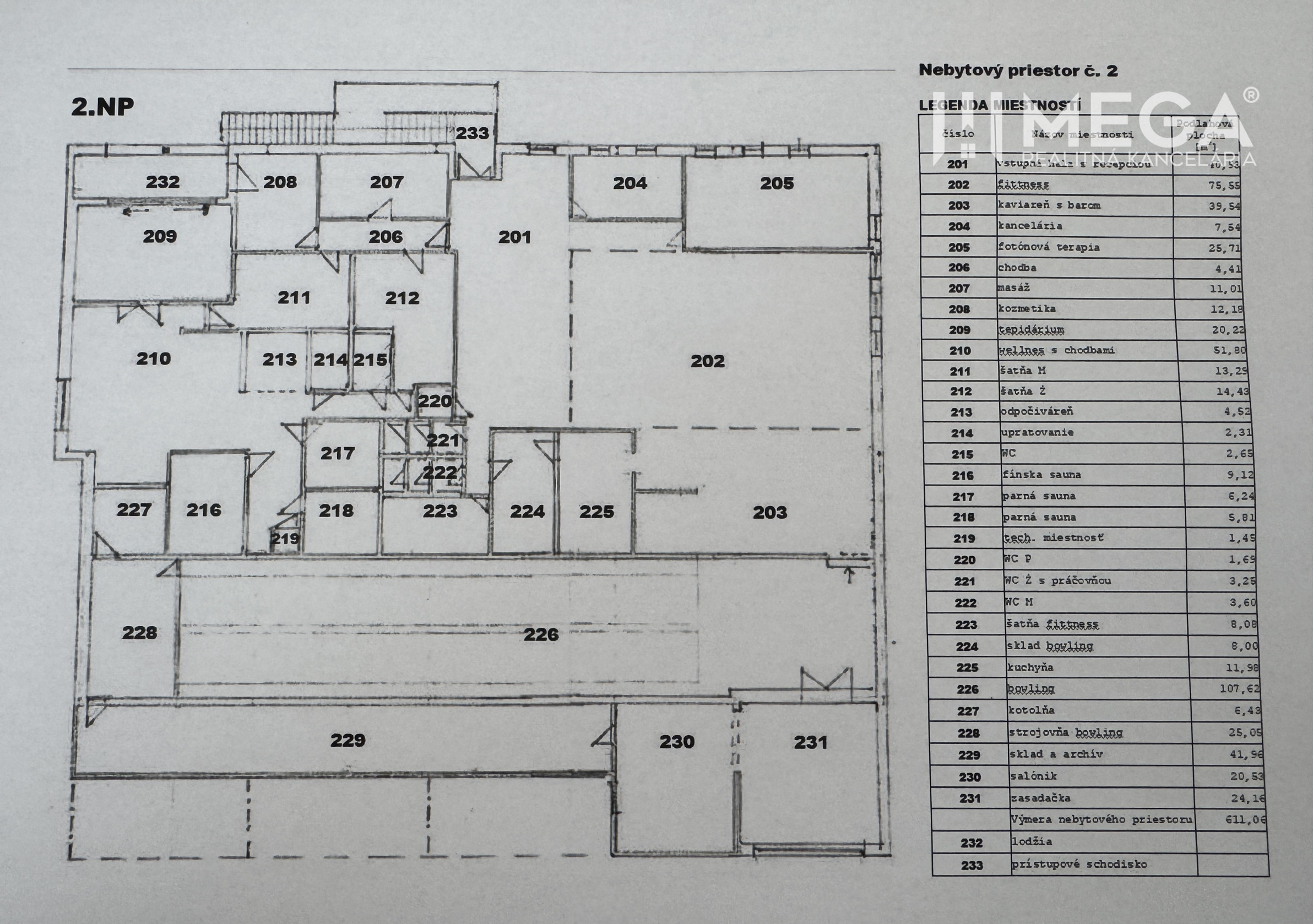 2. nadzemné podlažie (611 m²):využívané na služby ajo sú kozmetika,masáže,fotónovaá terapia,fitness cvičenie.Pozostáva z priestorov -vstupná hala s recepciou,kaviareň s barom,3x sauna,odpočívareň,kancelária,bowling,šatne, toalety aj sklad.